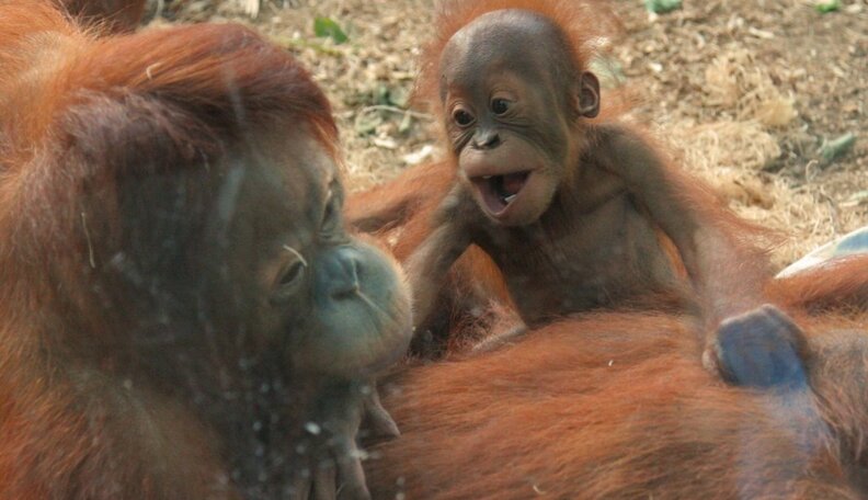 Orangutan babies are clingy - in the literal sense. Orangutan mothers maintain physical contact with their babies for the entire commencement iv months of its life. They never permit go. Non once! The kids cling to Mom for the next v years, sometimes breastfeeding well into their sixth twelvemonth of life.